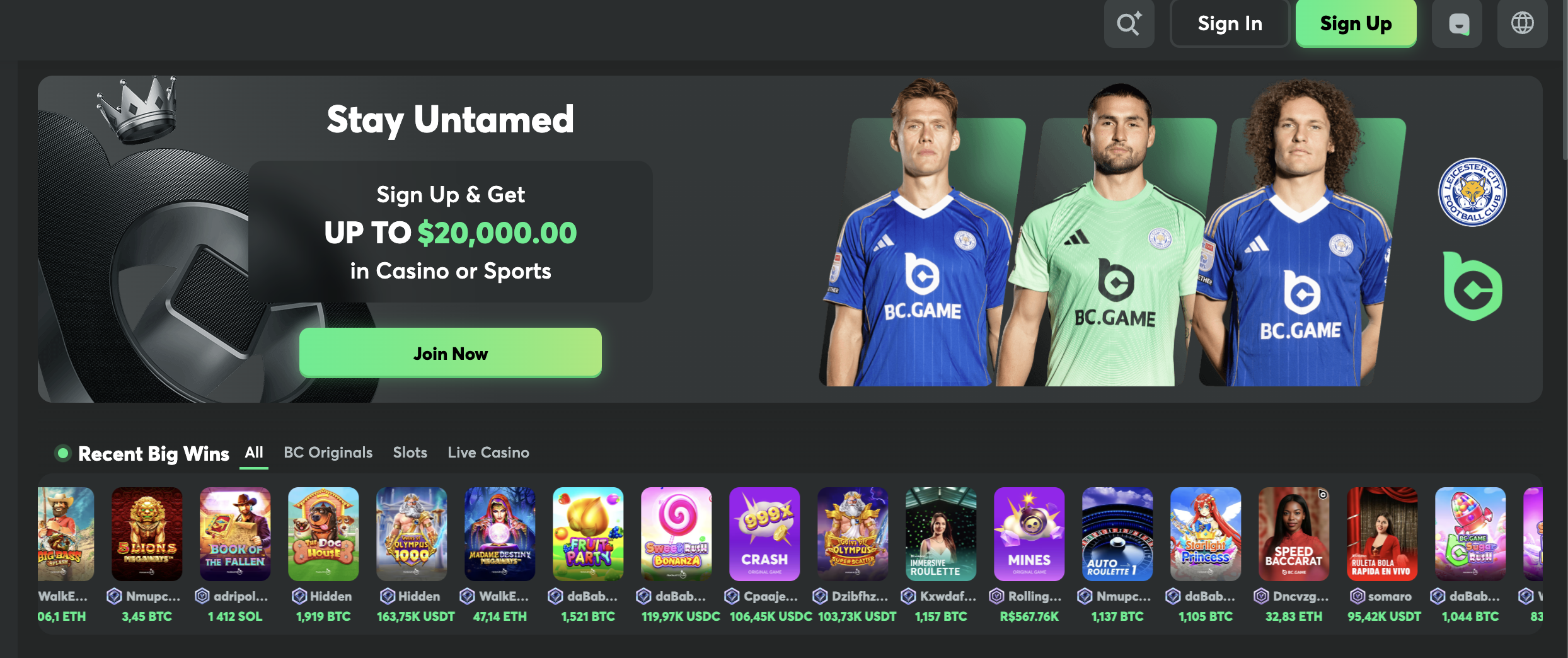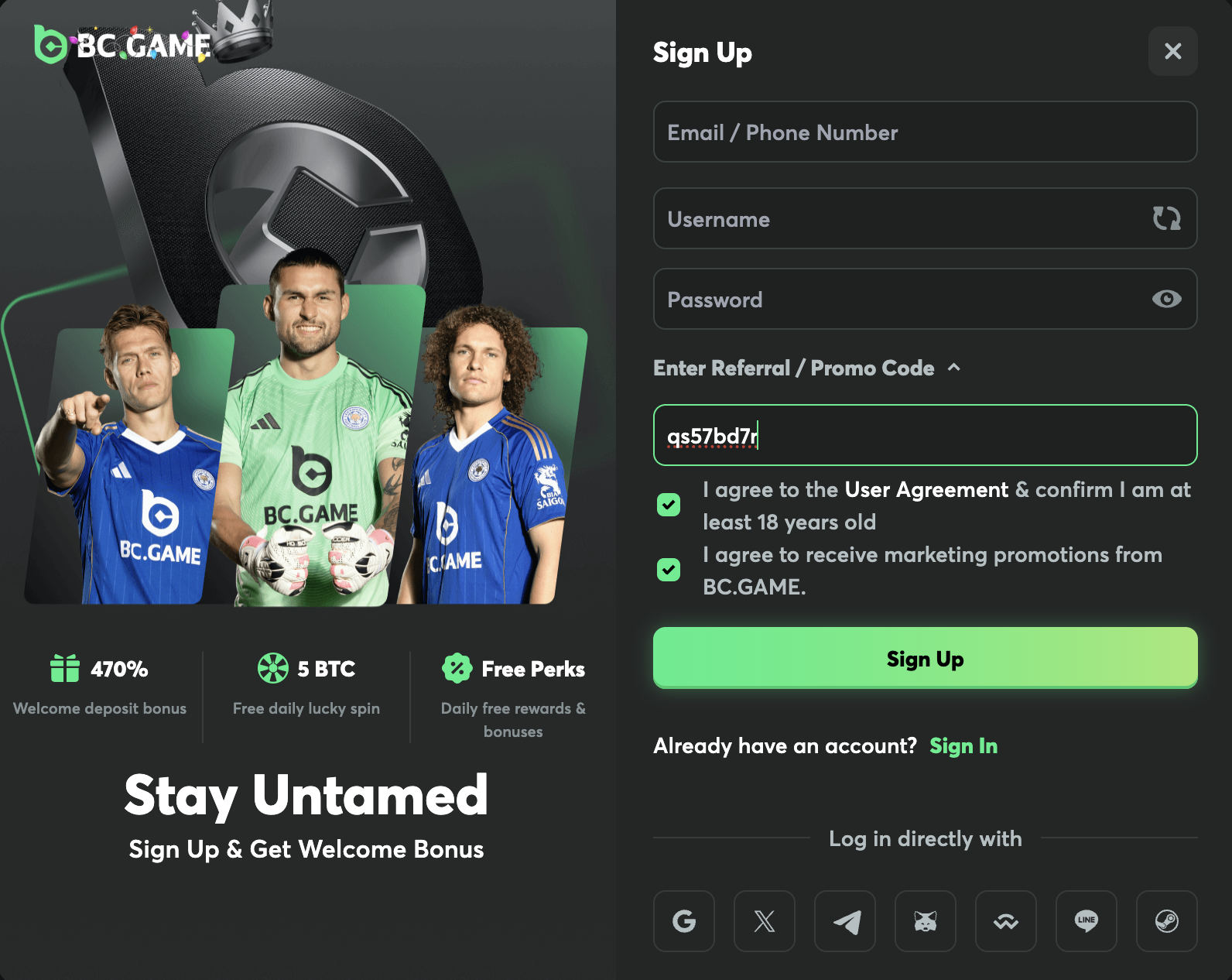 Accesează site-ul oficial BC Game și asigură-te că te afli pe platforma corectă. - Apasă pe „Sign Up” în colțul din dreapta sus